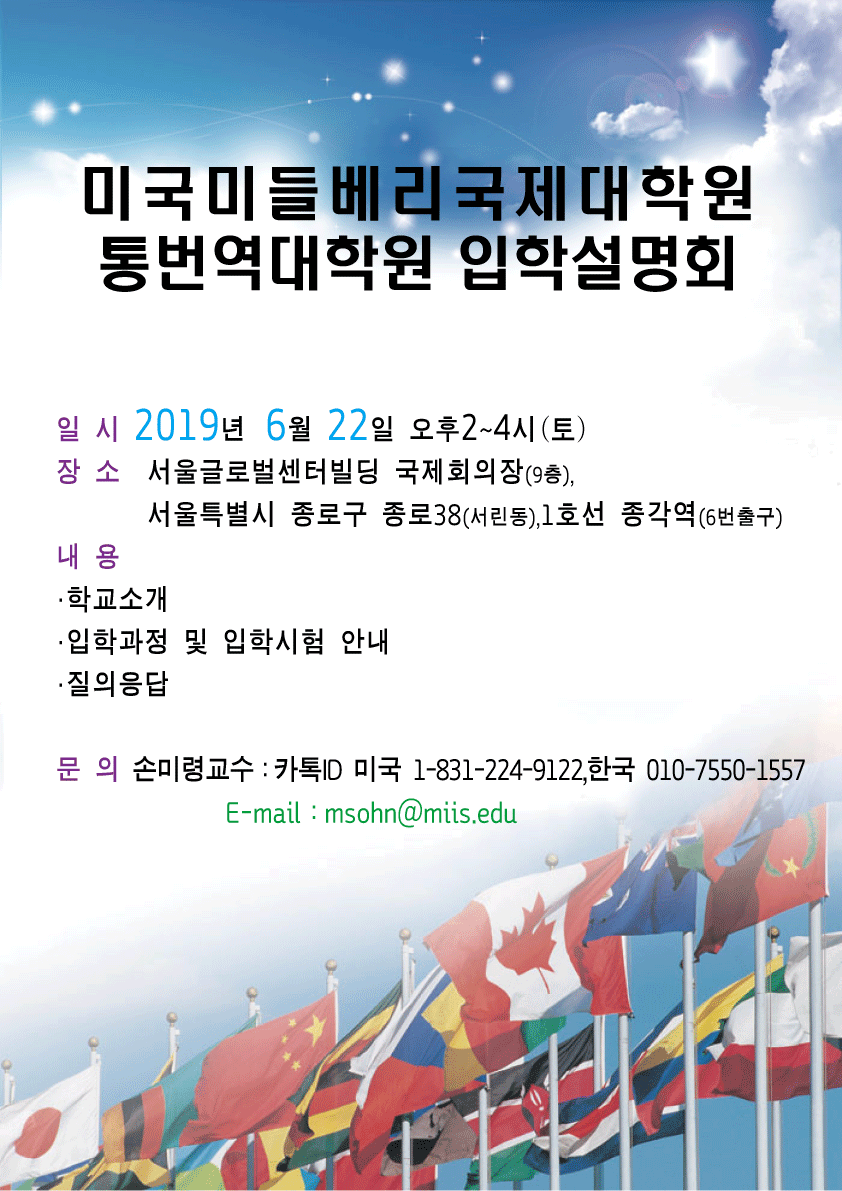 이창용어학원입니다. 미국 캘리포니아주 몬터레이 소재 미들베리 국제대학원(Middlebury Institute of International Studies at Monterey) 통번역대학원 입학설명회가 아래와 같이 개최됩니다. 미국 미들베리국제대학원 통번역대학원 입학설명회 장소: 서울글로벌센터빌딩 9층 국제회의장 지하철 1호선 종각역, 6번출구 연락: 손미령교수 010-7550-1557 관심 있으신 수강생의 많은 참여 바랍니다.